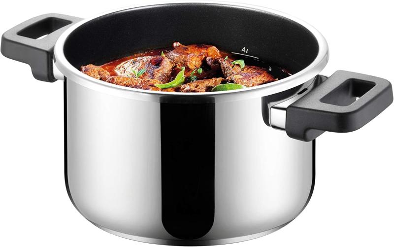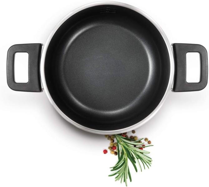 Luxus kukta IDEALCOOK rendszerrel az ideális nyomás könnyű beállításáért és kiváló minőségű tapadásgátló bevonattal. Kiválóan alkalmas az összes gyakori étel gyors és kíméletes elkészítéséhez az odaégés veszélye nélkül. A nagy, elfordítható fedőnek köszönhetően az edény kényelmesen nyitható és zárható egy kézzel is. A kukta nyomásjelzővel, 4 biztonsági szeleppel és ergonomikus fülekkel rendelkezik, első osztályú rozsdamentes acélból illetve ellenálló műanyagból készül. A háromrétegű szendvicsalj valamennyi típusú tűzhellyel – gáz, villany, kerámia, indukciós – kompatibilis.